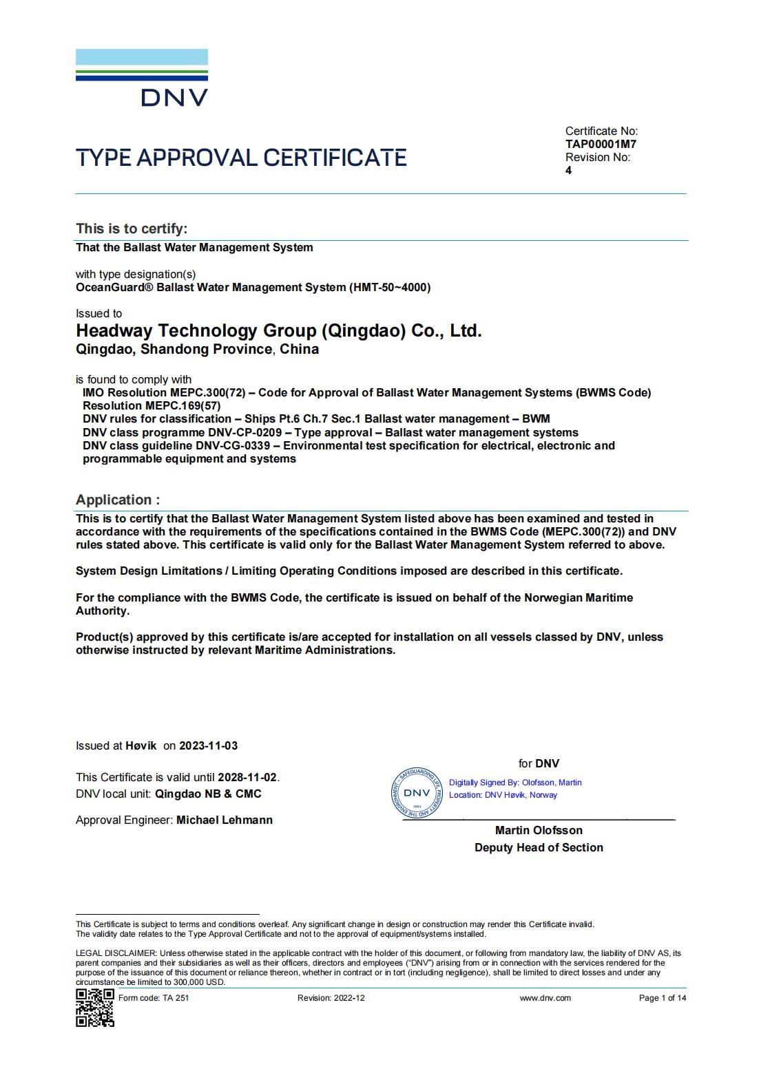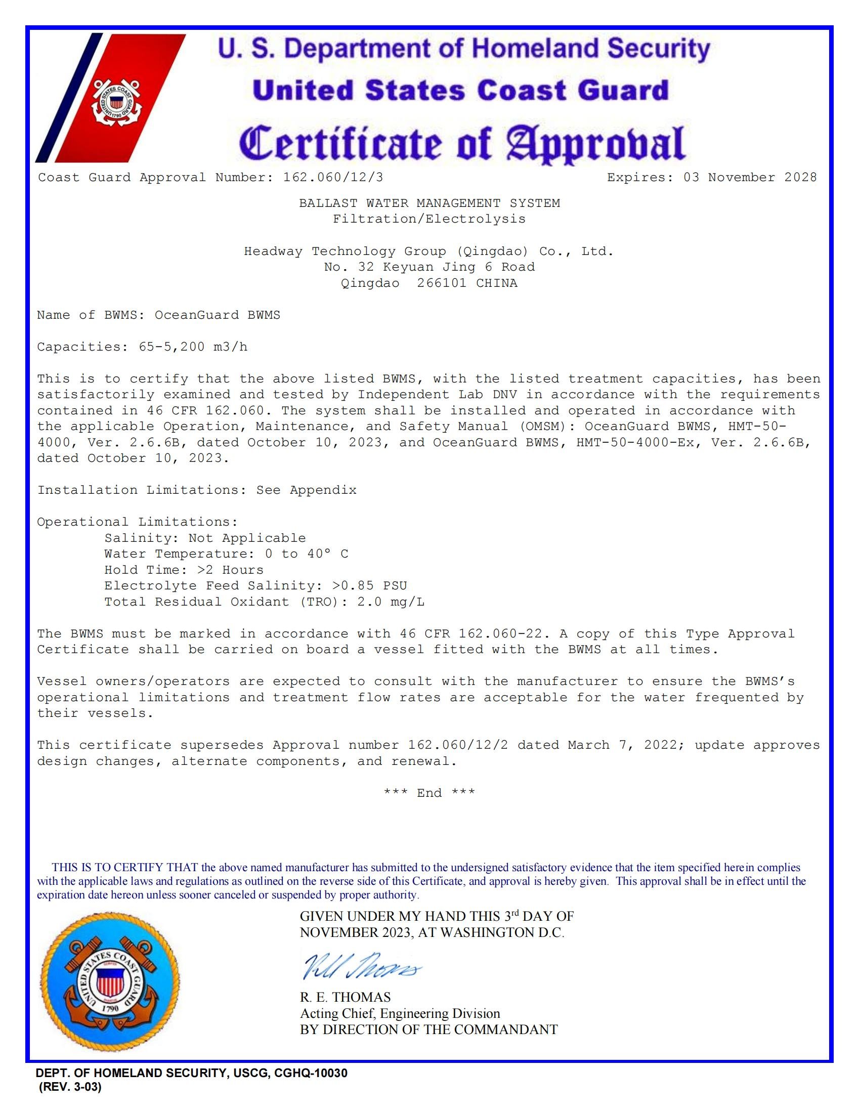 IMO BWMS Code 型式認(rèn)可證書(shū)